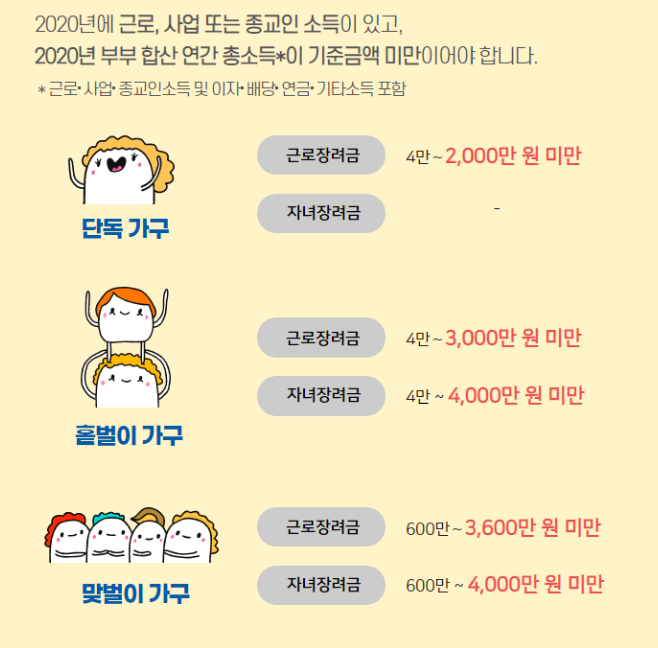 자세히 살펴보면, 단독가구의 경우 총소득 2000만원이하, 홑벌이 가구의 경우 3000만원이하, 맞벌이 가구의 경우 3,600만원이하인 경우 근로장려금 신청이 가능합니다.