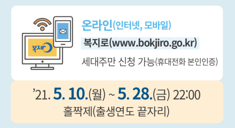 인터넷이나 모바일을 통한 온라인 신청의 경우에는 복지로 홈페이지를 통해 5월 10일부터 5월 28일까지 오후 22시까지 진행됩니다. 신청은 세대주만 가능하며 휴대전화 본인인증을 통해 신청할 수 있습니다.
