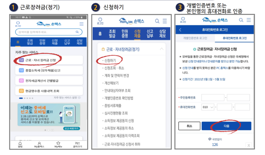 모바일 손택스앱이나 PC를 통해 홈택스에서도 신청이 가능합니다. 모바일에 손택스 앱을 설치한 뒤, 본인인증을 거쳐 근로장려금을 신청할 수 있으며, 인터넷으로는 홈택스 홈페이지에 접속하여 본인인증 후 신청이 가능합니다.